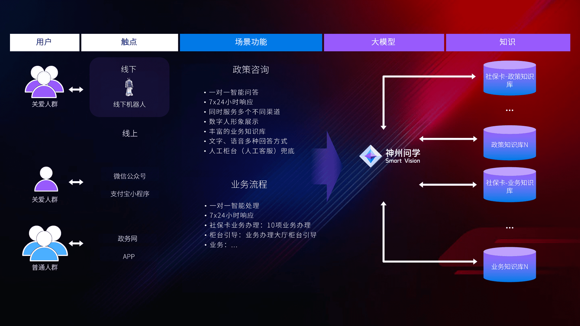 • 利用大语言模型+RAG技术,,,,支持多轮对话,,,,可识别多种同义词、、、、近义词,,,精准理解关爱人群语义快速输出结果。。